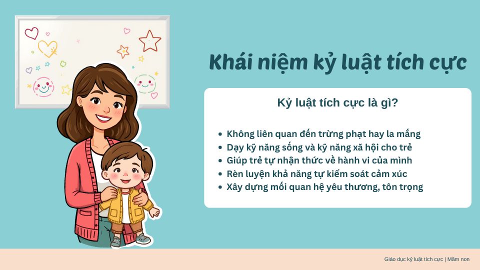 Kỷ luật tích cực không liên quan tới trừng phạt (điều mà nhiều người thường nghĩ rằng song hành theo kỷ luật), nội dung chính của kỷ luật tích cực tập trung vào việc dạy các kỹ năng xã hội và kỹ năng sống cho trẻ mầm non. Kỷ luật với trẻ nhỏ bao gồm những phần nội dung mà phụ huynh quyết định đặt thành mục tiêu giáo dục con, sau đó kiên định tuân theo. Khi con bạn trưởng thành và trau dồi được nhiều kỹ năng, bạn có thể thu hút bé vào quá trình tìm kiếm các giải pháp trong phạm vi giới hạn đặt ra. Theo cách này, bé sẽ rèn luyện kỹ năng tư duy, cách để nói không, cảm nhận sự cần thiết của nỗ lực. Ngoài ra, bé cũng học được việc kiên quyết theo đuổi mục tiêu và giới hạn hành vi của mình. Những nguyên tắc của kỷ luật tích cực sẽ giúp phụ huynh xây dựng mối quan hệ lâu dài về tình yêu thương, sự tôn trọng, giúp bố mẹ và con cùng giải quyết các tình huống.