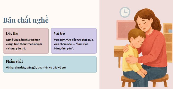 Giáo viên mầm non là người thầy đầu tiên và quan trọng, dạy trẻ những bài học đầu tiên của cuộc đời, là người ươm mầm nhân cách cho trẻ. Đây là nghề có tính đặc thù. Đặc điểm của nghề này là ngòai chuyên môn nghiệp vụ vững vàng, các bạn trẻ phải có tinh thần trách nhiệm cao trong công việc và lòng yêu trẻ. Là người thầy biết vị tha, chu đáo, gần gũi và nâng niu trẻ em. Giáo viên mầm non không chỉ dạy mà còn phải dỗ, không chỉ giáo dục mà còn phải chăm sóc trẻ và điều quan trọng hơn hết đây là nghề “làm việc tình yêu”.