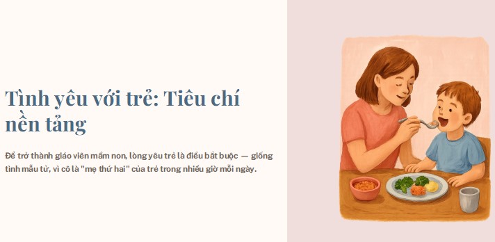 Để trở thành giáo viên mầm non, bạn phải có lòng yêu trẻ vì đặc thù của nghề này đòi hỏi giáo viên tình yêu của người mẹ đối với trẻ. Trong một ngày, hầu hết thời gian sinh họat của trẻ là ở trường với cô. Cô làm mẹ cho bé ăn, dỗ ngủ. Cô làm thầy dạy cho bé tất cả mọi điều cần thiết đầu đời như: kỹ năng sống, kiến thức về môi trường xung quanh, về tóan, văn học, thẩm mỹ, hội họa, âm nhạc, phát triển thể chất,… ngòai ra, trẻ còn mong chờ ở cô sự quam tâm, chăm sóc, sự giúp đỡ, trìu mến và bảo vệ trẻ…Với thời gian 8 tiếng, có khi là 10 tiếng mỗi ngày, các cô được chứng kiến rất nhiều họat động của trẻ. Nào là tiếng trẻ khóc, tiếng trẻ vui đùa, trẻ chạy nhảy, trẻ va vào nhau, trẻ ngã, trẻ đánh nhau… về nhà các cô phải sọan giáo án, đồ dùng dạy học, làm đồ chơi… đòi hỏi người giáo viên phải rất yêu trẻ, yêu nghề.
