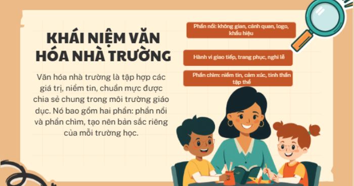 Trong một tổ chức nói chung cũng như một Nhà trường, văn hóa luôn tồn tại trong mọi hoạt động tổ chức đó. Vấn đề là con người có ý thức được sự tồn tại của nó để quản lý và sử dụng sức mạnh của nó hay không. Bản thân văn hóa rất đa dạng và phức tạp. Do đó, khi có những tiếp cận nghiên cứu khác nhau sẽ dẫn đến có nhiều quan niệm về văn hóa, nhưng tựu chung lại, các nhà nghiên cứu đều có một nghĩa chung căn bản: văn hóa là sự giáo hóa, vun trồng nhân cách con người, làm cho con người và cuộc sống con người trở nên tốt đẹp hơn. Với cách tiếp cận cơ bản như vậy, tác giả xin được đưa ra khái niệm văn hóa Nhà trường như sau: Văn hóa nhà trường là một tập hợp các giá trị, niềm tin, hiểu biết, chuẩn mực cơ bản được các thành viên trong Nhà trường cùng chia sẻ và tạo nên bản sắc của Nhà trường đó.Căn cứ theo hình thức biểu hiện thì văn hóa nhà trường gồm phần nổi có thể nhìn thấy như: không gian cảnh quan nhà trường, lôgô, khẩu hiệu, hành vi giao tiếp... và phần chìm không quan sát được như: niềm tin, cảm xúc, thái độ...