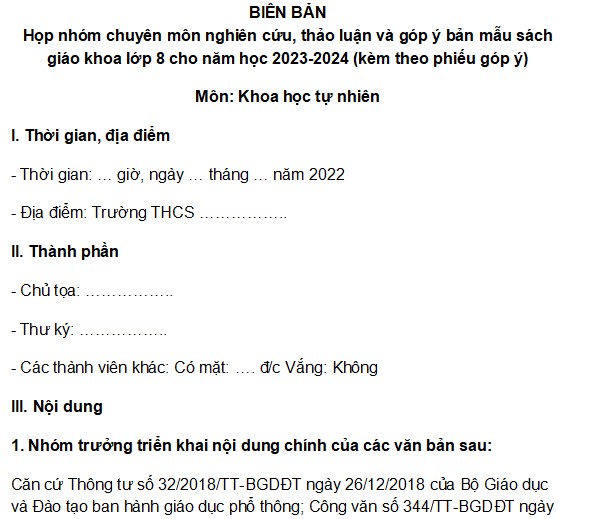 1. Biên bản nhận xét, đánh giá SGK Khoa học tự nhiên lớp 8