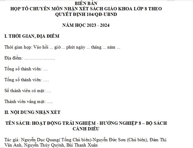 2. Biên bản nhận xét, đánh giá SGK Hoạt động trải nghiệm lớp 8