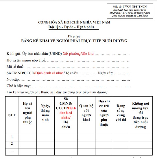 Bản kê khai về người phải trực tiếp nuôi dưỡng - Mẫu 07/XN-NPT-TNCN