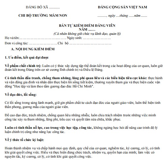 1. Mẫu bản kiểm điểm Đảng viên cuối năm giáo viên mầm non
