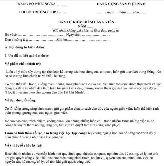 Bản kiểm điểm Đảng viên cuối năm giáo viên THPT