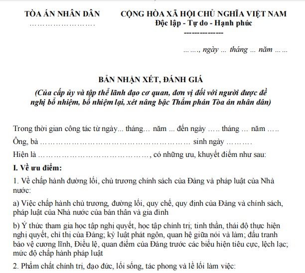 Bản nhận xét đánh giá đối với người được xét nâng bậc thẩm phán tòa án nhân dân (PDF)