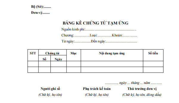 BẢNG KÊ CHỨNG TỪ TẠM ỨNG