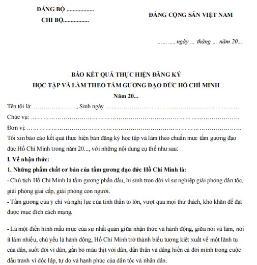Tôi xin báo cáo kết quả thực hiện bản đăng ký học tập và làm theo chuẩn mực tấm gương đạo đức Hồ Chí Minh trong năm 20..., với những nội dung cụ thể như sau: