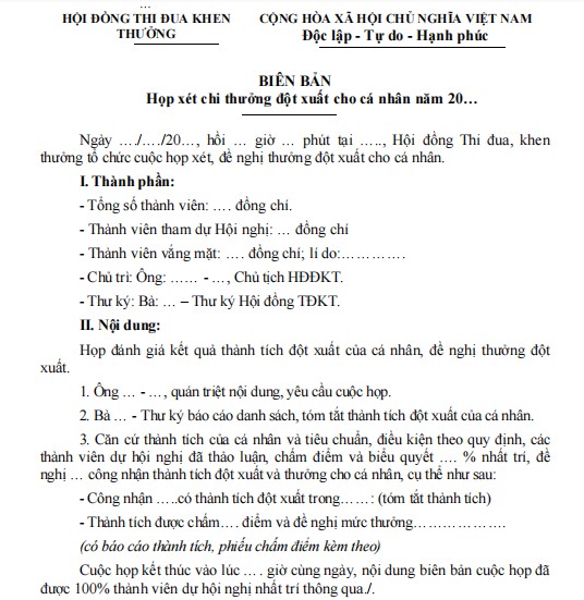 1. Mẫu Biên bản họp xét chi thưởng đột xuất cho cá nhân