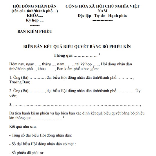 Biên bản kết quả biểu quyết bằng hình thức bỏ phiếu kín về nội dung khác tại Kỳ họp thứ nhất HĐND được lập nhằm ghi nhận đầy đủ, chính xác ý chí của các đại biểu về nội dung khác được đưa ra thảo luận. Biên bản này là tài liệu hành chính quan trọng, phản ánh kết quả biểu quyết, số phiếu hợp lệ, số phiếu không hợp lệ, tỷ lệ đồng ý và không đồng ý. Việc lập biên bản phải tuân thủ nguyên tắc khách quan, minh bạch, đúng quy trình, đảm bảo tính pháp lý và là căn cứ để HĐND xem xét, quyết định các nội dung liên quan. Đây cũng là minh chứng cho sự dân chủ, công khai trong hoạt động của cơ quan dân cử, mời các bạn tham khảo.