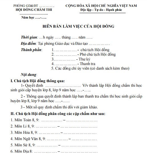 2. Nội dung Biên bản hội đồng chấm thi học sinh giỏi
