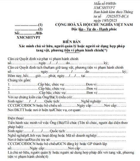 Biên bản xác minh chủ sở hữu, người quản lý hoặc người sử dụng hợp pháp tang vật, phương tiện vi phạm hành chính