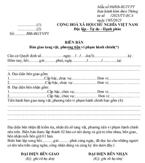 Mẫu số 06/BB-BGTVPT Ban hành kèm theo Thông tư số /2025/TT-BCA ngày 19/5/2025 |