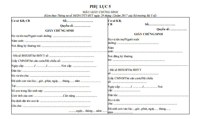 Mẫu giấy chứng sinh mới nhất theo Thông tư 56/2017/TT-BYT là mẫu tại Phụ lục 5: