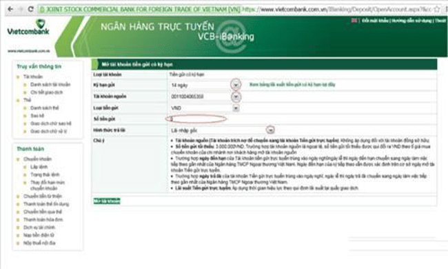 Trong cột bên trái của màn hình giao dịch của Ngân hàng điện tử, trong mực "Tiền gửi trực tuyến" bạn vào chọn "Mở tài khoản".