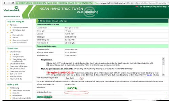 Khi đó, một "Mã giao dịch OTP" của Vietcombank sẽ được gửi tin nhắn đến số điện thoại của bạn, đây coi như mật khẩu kích hoạt tài khoản tiền gửi tiết kiệm của bạn.