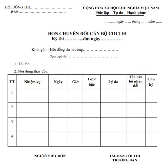 Đơn chuyển đổi cán bộ coi thi