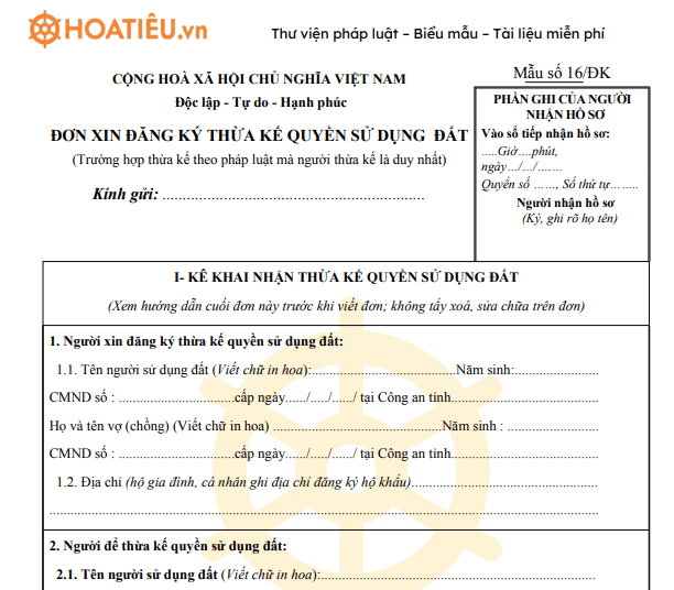 Đơn đăng ký thừa kế quyền sử dụng đất 2025 mới nhất (Mẫu số 16/ĐK)