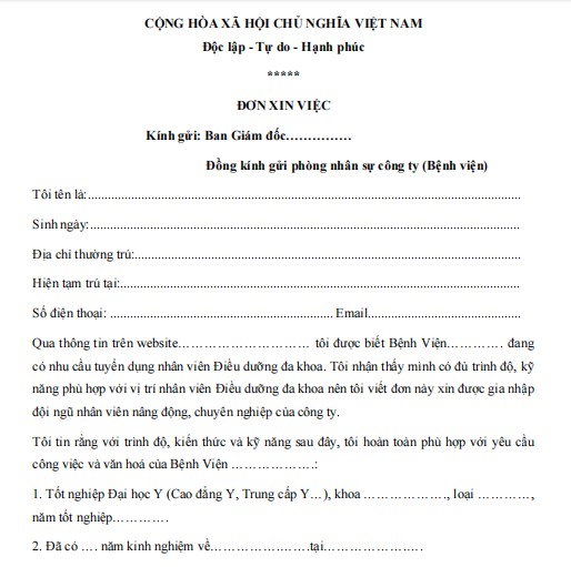1. Mẫu đơn xin việc viết tay cho điều dưỡng viên