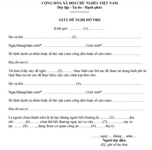 Tôi làm Giấy này đề nghị ………(3)……… thực hiện các thủ tục để được sử dụng kinh phí từ Quỹ Bảo trợ trẻ em để thực hiện việc cứu chữa kịp thời cho: