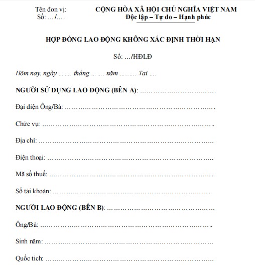 Mẫu hợp đồng lao động không xác định thời hạn mới nhất hiện nay