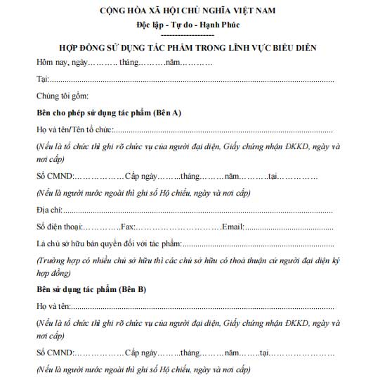 1. Mẫu hợp đồng sử dụng tác phẩm trong lĩnh vực biểu diễn