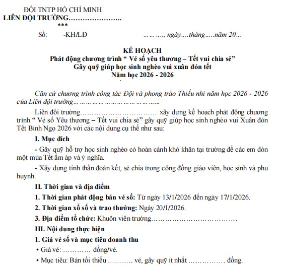 Trên đây là kế hoạch phát động chương trình “Vé số Yêu thương – Tết vui chia sẻ” gây quỹ giúp học sinh nghèo vui Xuân đón Tết Bính Ngọ 2026 của Liên Đội Trường …………………………. Đề nghị các anh chị phụ trách và BCH các chi đội triển khai thực hiện có hiệu quả./.