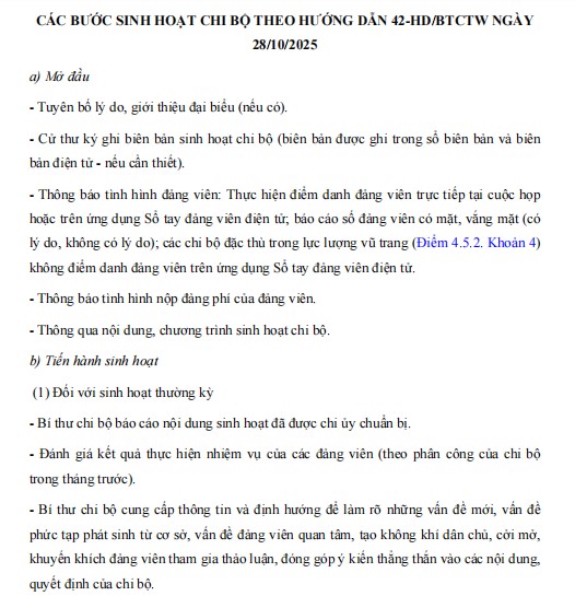 CÁC BƯỚC SINH HOẠT CHI BỘ THEO HƯỚNG DẪN 42-HD/BTCTW