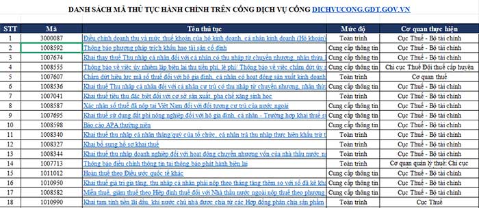 Tải File excel Mã thủ tục hành chính nộp tờ khai thuế trong bài viết.