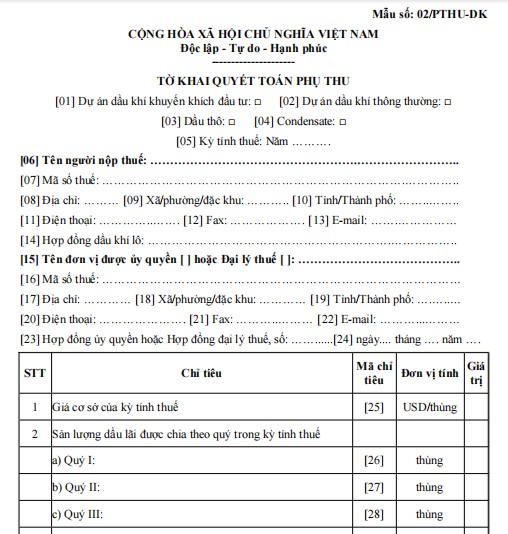 2. Nội dung tờ khai quyết toán phụ thu