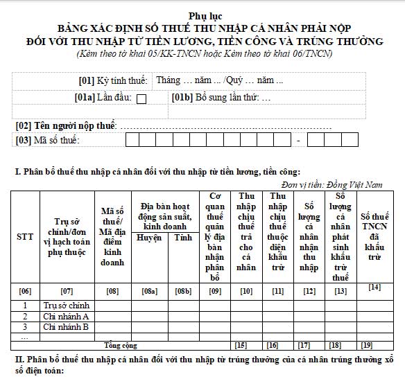 Mẫu 05-1/PBT-KK-TNCN: Bảng xác định số thuế TNCN phải nộp đối với thu nhập từ tiền lương, tiền công và trúng thưởng