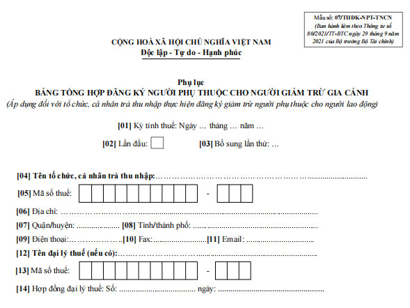 1. Mẫu 07/THĐK-NPT-TNCN: Bảng tổng hợp đăng ký người phụ thuộc cho người giảm trừ gia cảnh