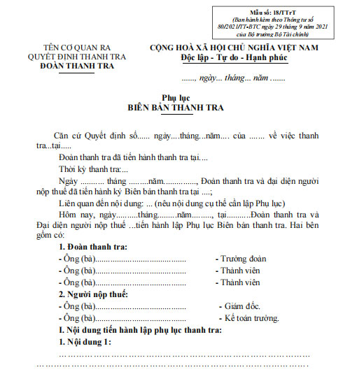 1. Mẫu 18 TTrT Thông tư 80 Phụ lục biên bản thanh tra thuế