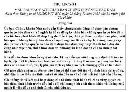 Mẫu bản cáo bạch chào bán chứng quyền có bảo đảm được ban hành kèm theo Thông tư số 122/2025/TT-BTC là văn bản hành chính quan trọng, nhằm cung cấp thông tin đầy đủ, minh bạch và chính xác cho nhà đầu tư trước khi tham gia giao dịch. Bản cáo bạch này đóng vai trò như một tài liệu công khai, giúp người mua chứng quyền nắm rõ các yếu tố liên quan đến sản phẩm, bao gồm điều kiện phát hành, quyền lợi, rủi ro, cũng như các quy định pháp lý hiện hành.