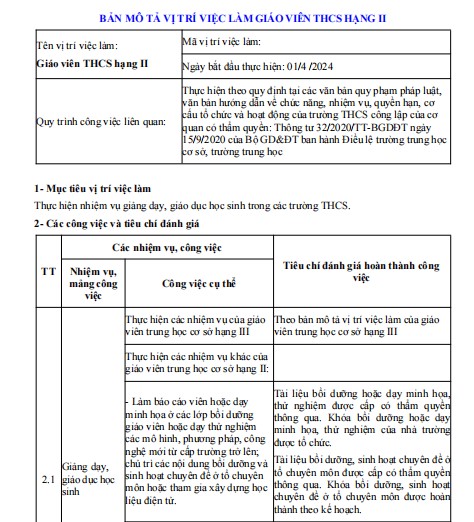 Mẫu bản mô tả vị trí việc làm giáo viên THCS hạng 2