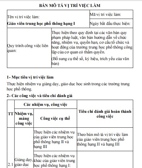 1. Bản mô tả vị trí việc làm giáo viên THPT hạng 1