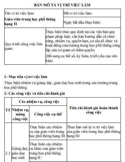 Mẫu bản mô tả vị trí việc làm giáo viên THPT hạng 2
