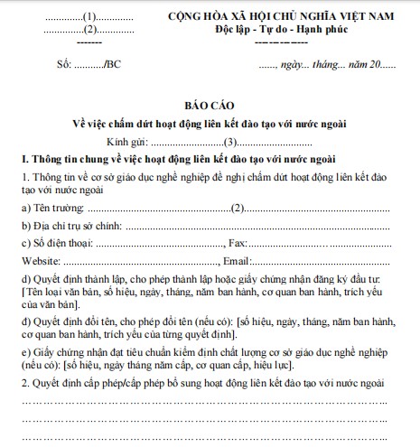1. Báo cáo chấm dứt hoạt động liên kết đào tạo với nước ngoài
