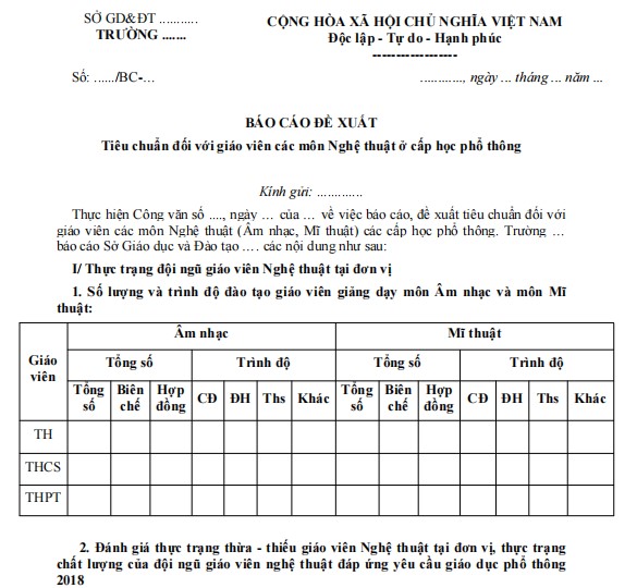 Mẫu báo cáo đề xuất tiêu chuẩn đối với giáo viên các môn nghệ thuật ở các cấp học phổ thông