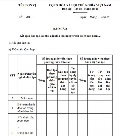Báo cáo này phản ánh đầy đủ kết quả đào tạo đã thực hiện trong thời gian qua, đồng thời xác định rõ nhu cầu đào tạo nâng trình độ chuẩn trong giai đoạn tiếp theo, làm căn cứ cho việc xây dựng kế hoạch, phân bổ nguồn lực và tổ chức triển khai theo đúng quy định của pháp luật. Việc lập báo cáo theo đúng mẫu giúp bảo đảm tính thống nhất, chính xác và minh bạch trong công tác quản lý giáo dục, phục vụ hiệu quả cho công tác chỉ đạo, kiểm tra, giám sát và báo cáo của cơ quan quản lý nhà nước có thẩm quyền, mời các bạn cùng tham khảo.