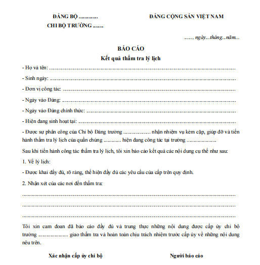 Việc thẩm tra lý lịch là một khâu bắt buộc, có ý nghĩa đặc biệt quan trọng trong quy trình xem xét kết nạp Đảng viên mới. Mẫu báo cáo kết quả thẩm tra lý lịch không chỉ phản ánh quá trình xác minh thông tin cá nhân của người xin vào Đảng mà còn là căn cứ để tổ chức Đảng đánh giá đầy đủ về tư cách chính trị, đạo đức, lối sống và mối quan hệ xã hội của quần chúng ưu tú. Báo cáo phải được lập theo đúng biểu mẫu quy định, đảm bảo trung thực, khách quan, có xác nhận của tổ chức có thẩm quyền và sự phối hợp chặt chẽ của các bên liên quan.