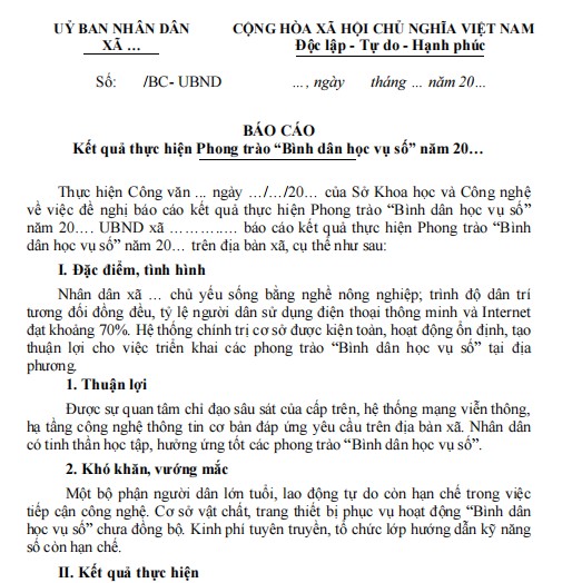 Trên đây là báo báo cáo kết quả triển khai thực hiện Phong trào “Bình dân học vụ số” trên địa bàn xã năm 20…. UBND xã … báo cáo Sở Khoa học và Công nghệ tổng hợp./.