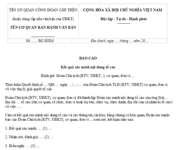 Mẫu Báo cáo Kết quả xác minh nội dung tố cáo được ban hành theo Quy định 05/QĐ-TLĐ năm 2024 là biểu mẫu quan trọng trong quy trình xử lý đơn tố cáo tại các cơ quan, đơn vị công đoàn, cũng như trong hệ thống cơ quan nhà nước. Mẫu báo cáo này thể hiện rõ kết quả xác minh, thu thập chứng cứ, đối chiếu thông tin và đánh giá mức độ đúng sai của nội dung tố cáo, làm căn cứ để đưa ra kiến nghị xử lý hoặc kết luận cuối cùng.