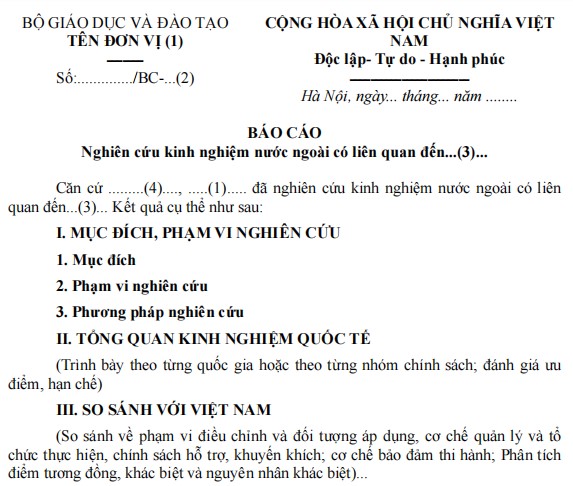 Mẫu Báo cáo nghiên cứu kinh nghiệm nước ngoài (Mẫu số 03 theo Thông tư 29/2026/TT-BGDĐT) là văn bản hành chính quan trọng, được sử dụng để tổng hợp, phân tích và trình bày kết quả nghiên cứu, học tập kinh nghiệm từ các quốc gia khác trong lĩnh vực giáo dục và đào tạo. Báo cáo này giúp các đơn vị, cơ sở giáo dục có cơ sở tham khảo, đối chiếu và áp dụng những giải pháp phù hợp vào thực tiễn quản lý, giảng dạy tại Việt Nam. Khi lập báo cáo, người viết cần tuân thủ đúng cấu trúc, ngôn ngữ hành chính, đảm bảo tính khách quan, khoa học và minh bạch. Việc sử dụng mẫu biểu thống nhất không chỉ tạo thuận lợi cho công tác quản lý mà còn nâng cao hiệu quả trong việc chia sẻ và áp dụng kinh nghiệm quốc tế.