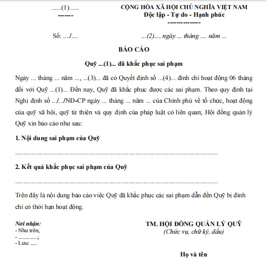 Biểu mẫu báo cáo khắc phục sai phạm quỹ từ thiện