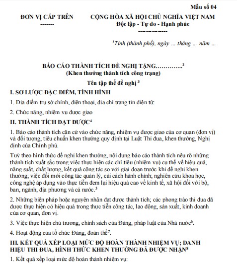 1. Báo cáo thành tích đề nghị khen thưởng công trạng cho tập thể