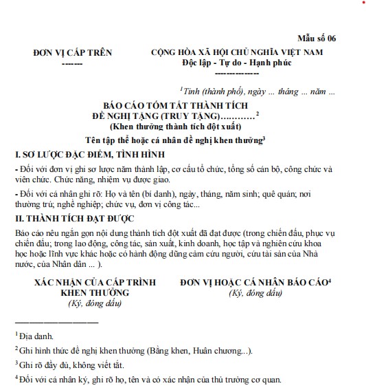 Mẫu báo cáo thành tích đề nghị khen thưởng đột xuất