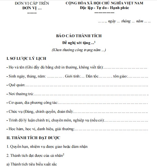 Biểu mẫu hành chính báo cáo thành tích cá nhân để xét khen thưởng