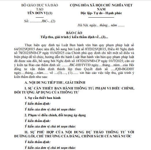 Thực hiện quy định tại Luật Ban hành văn bản quy phạm pháp luật số 64/2025/QH15 được sửa đổi, bổ sung bởi Luật số 87/2025/QH15, Điều 40 Nghị định số 78/2025/NĐ-CP ngày 01/4/2025 của Chính phủ quy định chi tiết một số điều và biện pháp để tổ chức, hướng dẫn thi hành Luật Ban hành văn bản quy phạm pháp luật đã được sửa đổi, bổ sung bởi Nghị định số 187/2025/NĐ-CP ngày 01/7/2025; căn cứ ý kiến tại Báo cáo thẩm định số: ........./BC-HĐTVTĐ ngày.....tháng....năm....của Hội đồng tư vấn thẩm định thành lập theo Quyết định số ...../QĐ-BGDĐT ngày.....tháng.....năm...... về ....(3)....., (1)....... xin báo cáo việc tiếp thu, giải trình ý kiến thẩm định như sau:
