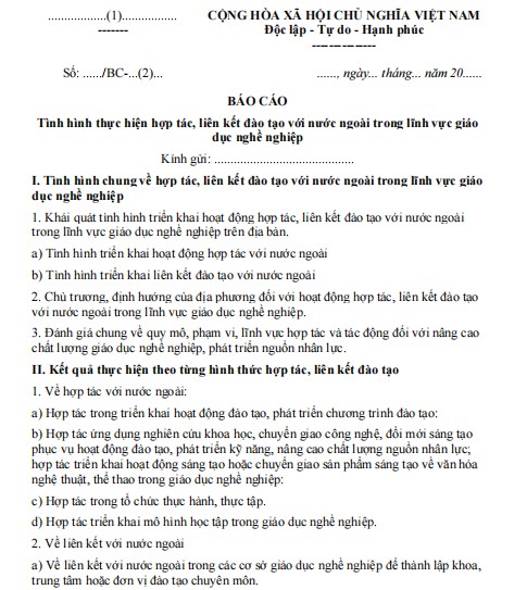 1. Mẫu Báo cáo tình hình thực hiện hợp tác, liên kết với nước ngoài trong lĩnh vực giáo dục nghề nghiệp